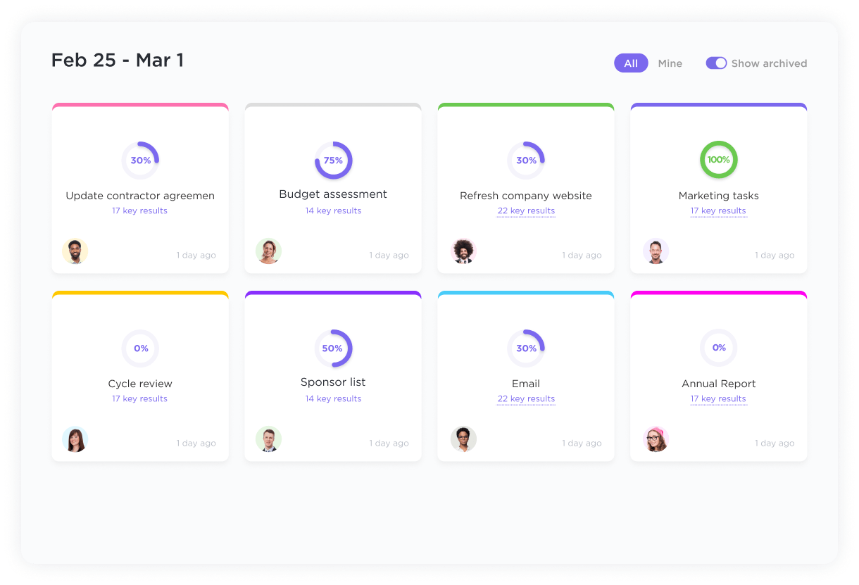 Through its Goals feature, ClickUp allows you to manage your team's OKRs alongside your projects, tasks, and other work. Objectives are added to ClickUp as Goals, and key results are visualized as measurable numerical, monetary, or task-based Targets, which live within their respective Goals. You can assign Goals to yourself or include multiple people in a single objective. As you complete individual Targets, your progress towards the overall objective is displayed as a percentage, making it easy to track individual and team updates on OKRs. These Goals can also be organized into folders, perfect for grouping and tracking OKR progress by department, team, time period, and more, all at a glance.