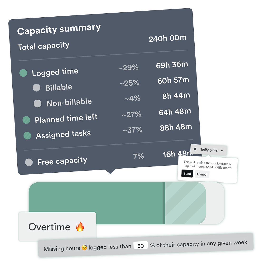 - Track Capacity with the People Dashboard. See who’s hitting their weekly hours and who’s overloaded. Remind the team to log their hours with one click- the more data you capture, the more accurate your insights.