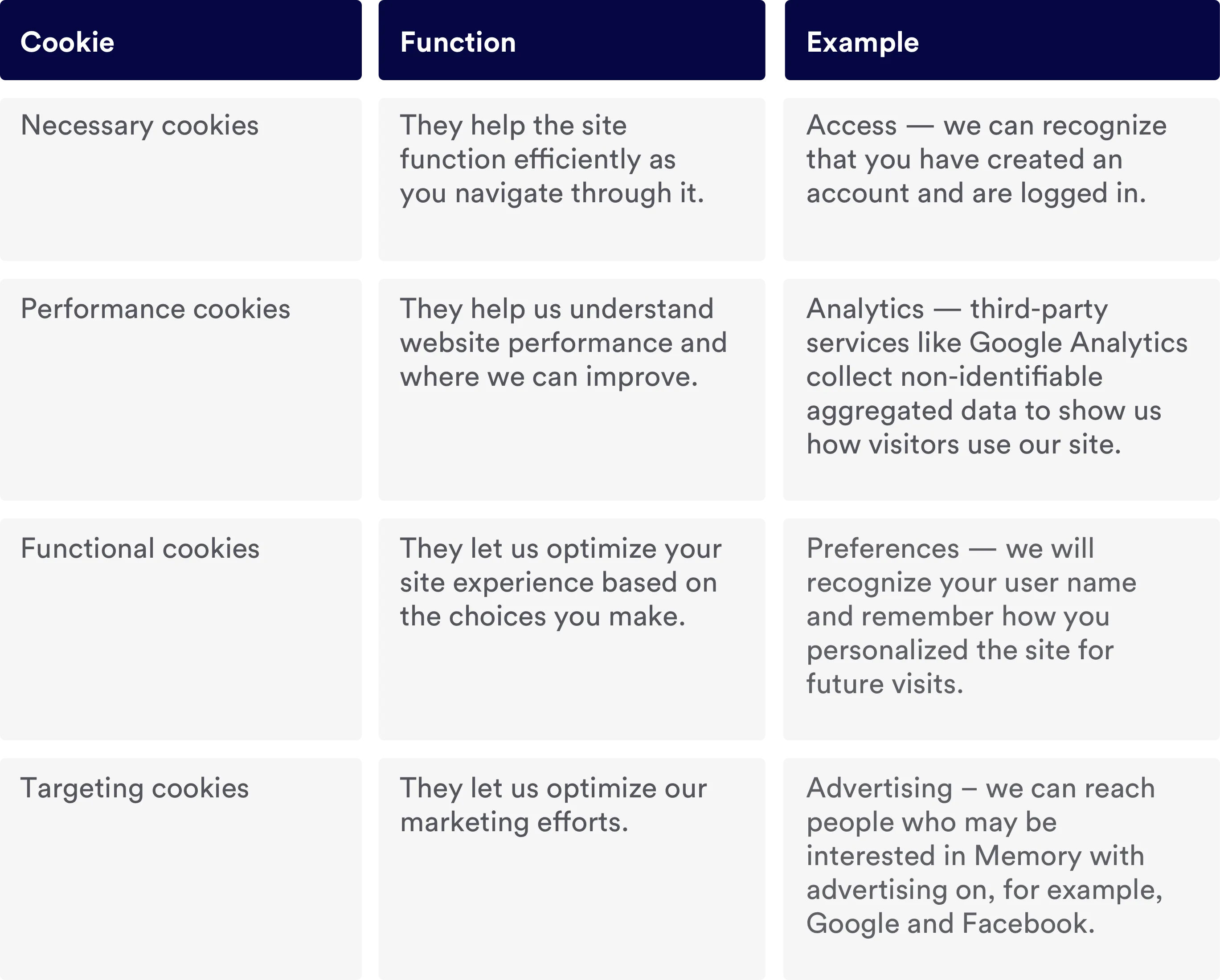 We use cookies to distinguish you from other people as you move around our website. These cookies help us improve your experience and optimize our website — we never use them for advertising or marketing. To help you provide informed consent, here’s a breakdown of the cookies we send and how we use them.