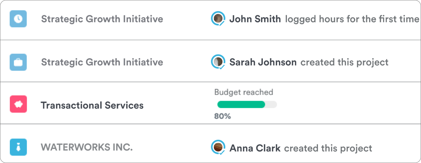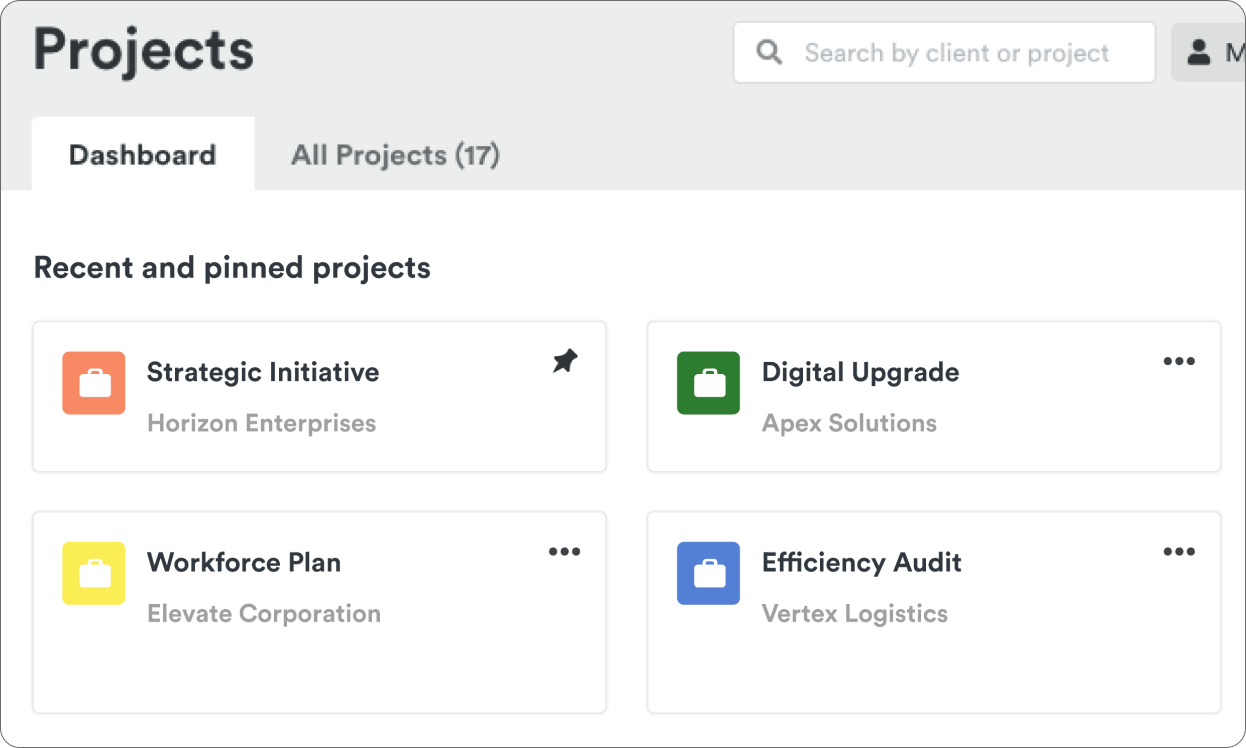 An all projects view for real-time tracking of key metrics like budget, hours, and progress, giving you a clear view of resources to make smarter decisions.