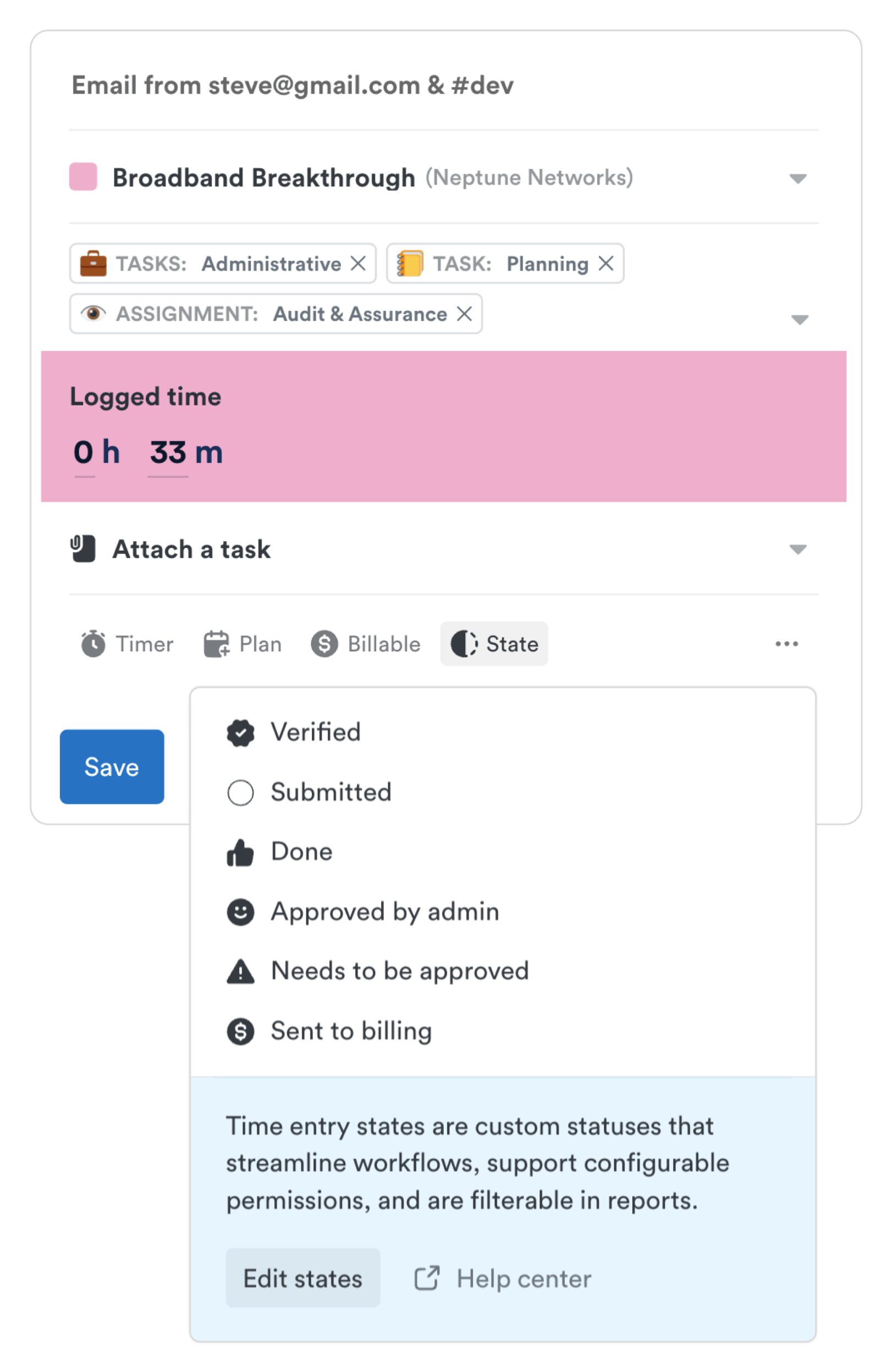 Streamline your time tracking process and enhance accountability with Time Entry States. Easily track, manage, and approve time entries with customized statuses that fit your unique business workflow.