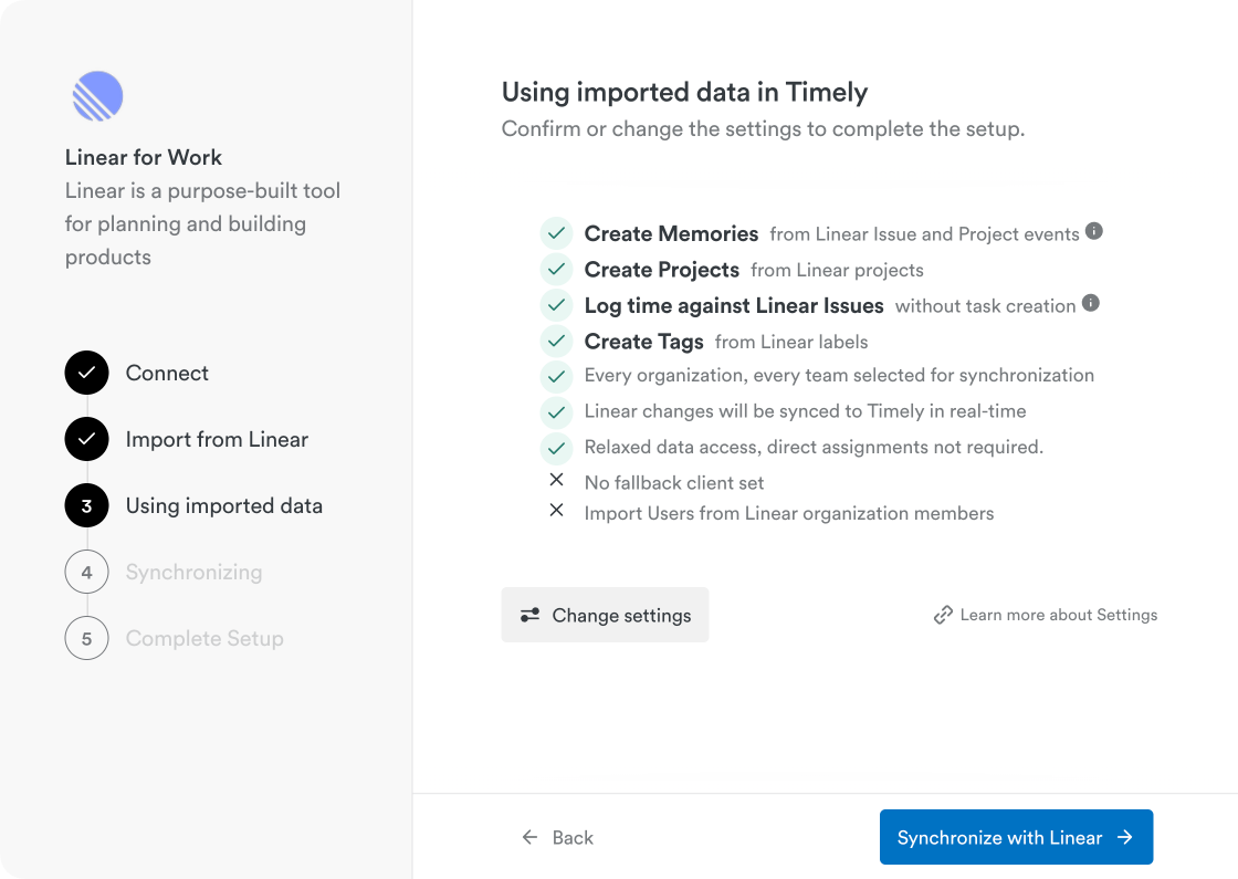 If issues are synced and a Linear team is not selected for syncing in Timely, its issues will not be imported or made available for time tracking.