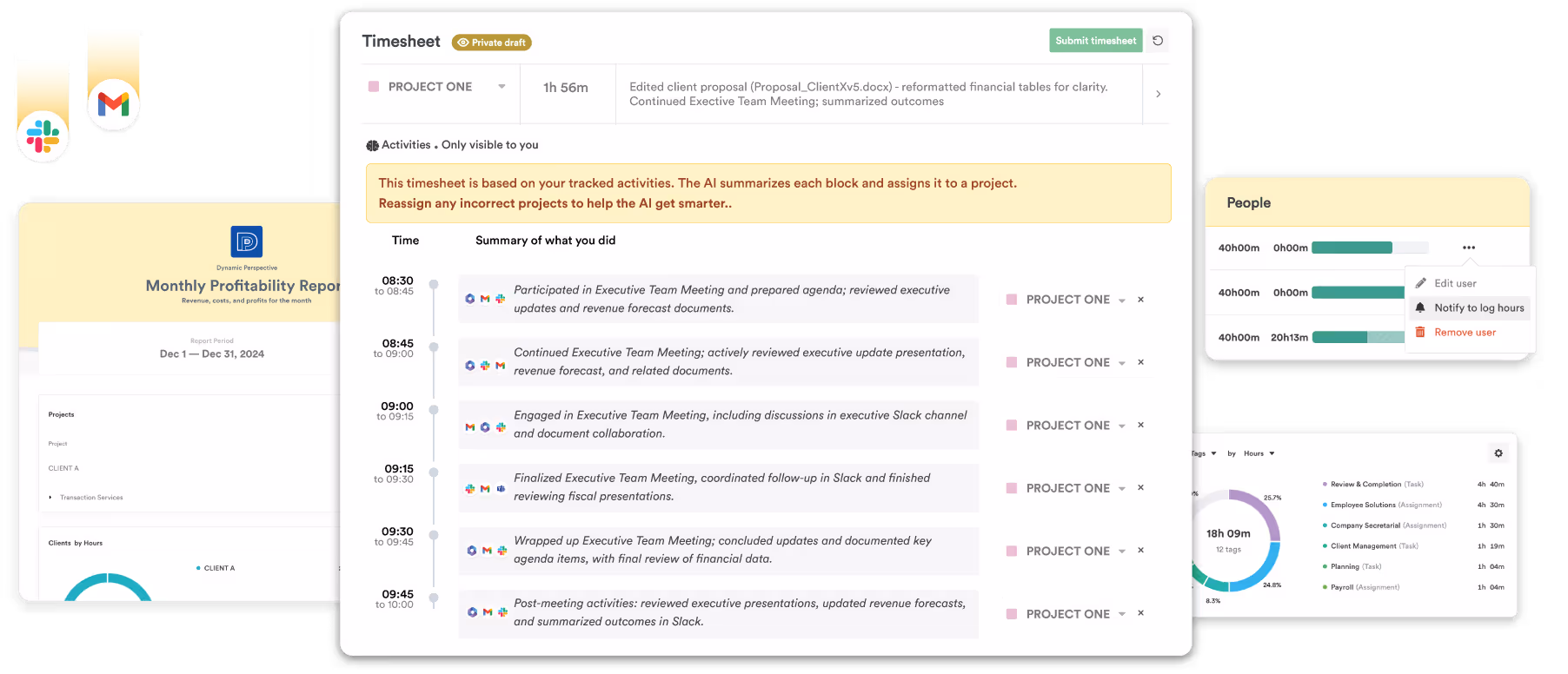 Focus on the work that matters the most and let Timely take care of the time tracking. With automatic AI powered time tracking and intelligent, one-click reporting you'll be able to optimize your team's time and drive real-time, data-backed business growth.