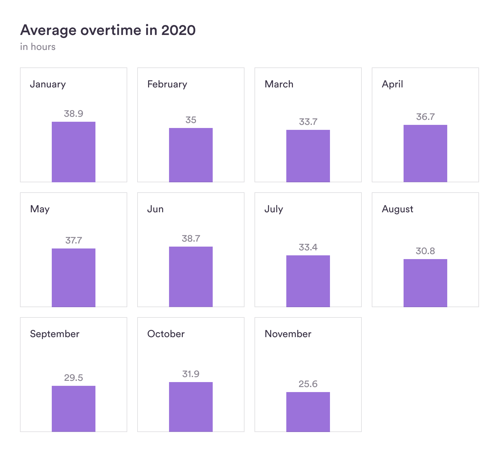 About 16% of Timely users put in overtime above their normal 40-hour working week, and that overtime was intense. The highest amount fell in spring, around the time of the the first coronavirus lockdowns — although January was also an extremely busy month. We’re quite shocked to see just how much extra time people were putting in, which in some cases nearly equated to a double working week. We're hoping that's mostly due to a reinvigoration of side projects.