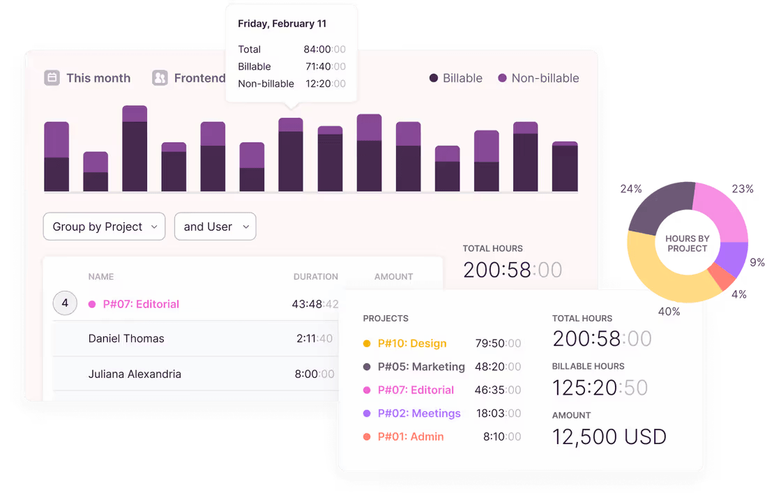 All the time tracking data for your timesheets is logged in a central dashboard. You can even set requirements for your employees for their time to be counted towards a timesheet, such as belonging to a certain project or task.