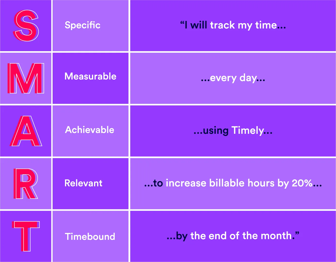 A measurable goal can be tracked and quantified. It needs a clear metric for success, such as a percentage or number of units sold. Examples of metrics might include sales figures, customer satisfaction ratings, productivity levels, or completion rates of specific tasks. So, instead of an unmeasurable target like 'increase billable hours' think 'Increase billable hours by 10% in the next 6 months by tracking time in Timely.'