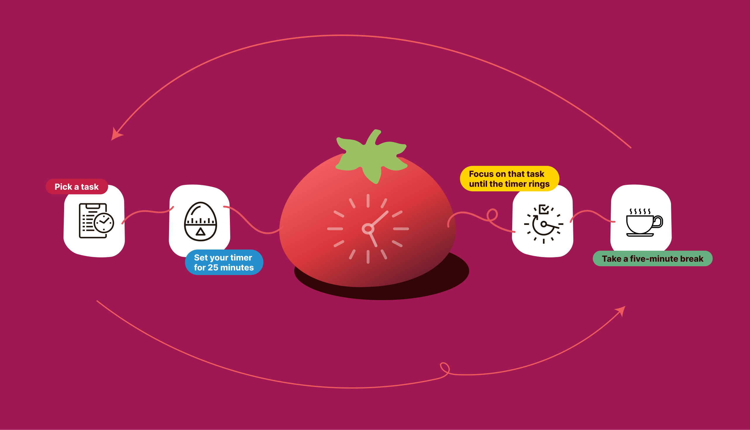 - Once the timer (tomato shape optional) goes off, you’ll take a short break. Typically, five minutes is what’s recommended you take at a time.