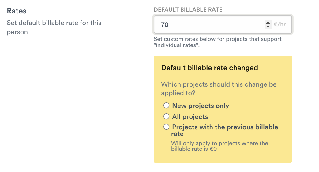 The same logic also applies for setting a default billable rate for different people in your workspace—just indicate whether the new rate should apply only to new projects, to all projects, or to projects using the previous billable rate.