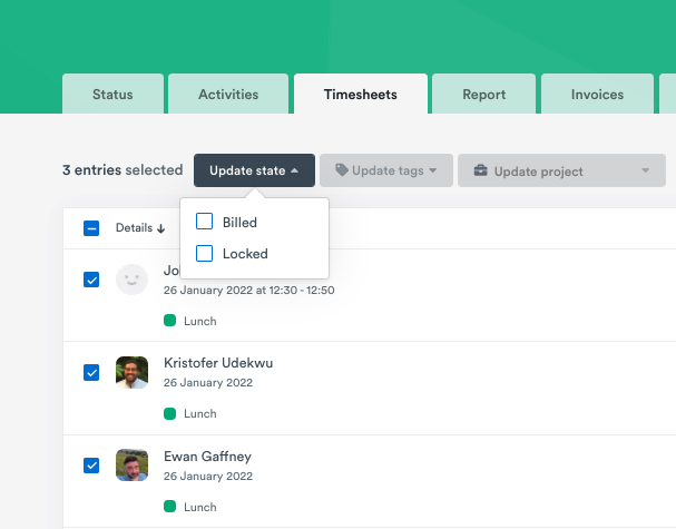- Timesheet management just got speedier! Admins and Managers can now lock time entries in bulk to prevent further edits being made without impacting billing reporting. Head to the “Timesheets” tab in the Reports page or a specific project page to try it out. Once locked, entries can only be unlocked by Admins—so enjoy your new powers responsibly.