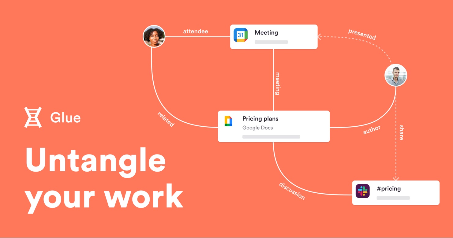 Glue is an automatic knowledge hub for navigating the creative process. It unifies scattered files and conversations, and helps you untangle your work. By leveraging AI — the same machine learning technology used in Timely and Dewo — it can also reveal relationships between your work and surface the most relevant information for any given moment.