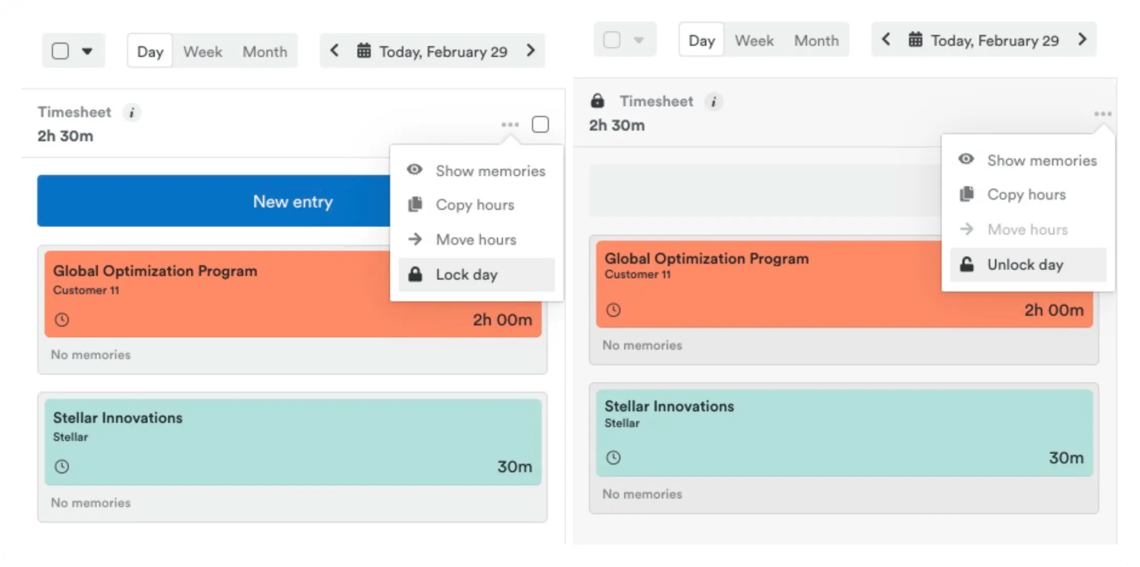 Lock/unlock with ease: Navigate to your workspace Hours page and select the desired day, week, or month. With just a few clicks, you can lock or unlock time entries, ensuring complete control and accuracy.