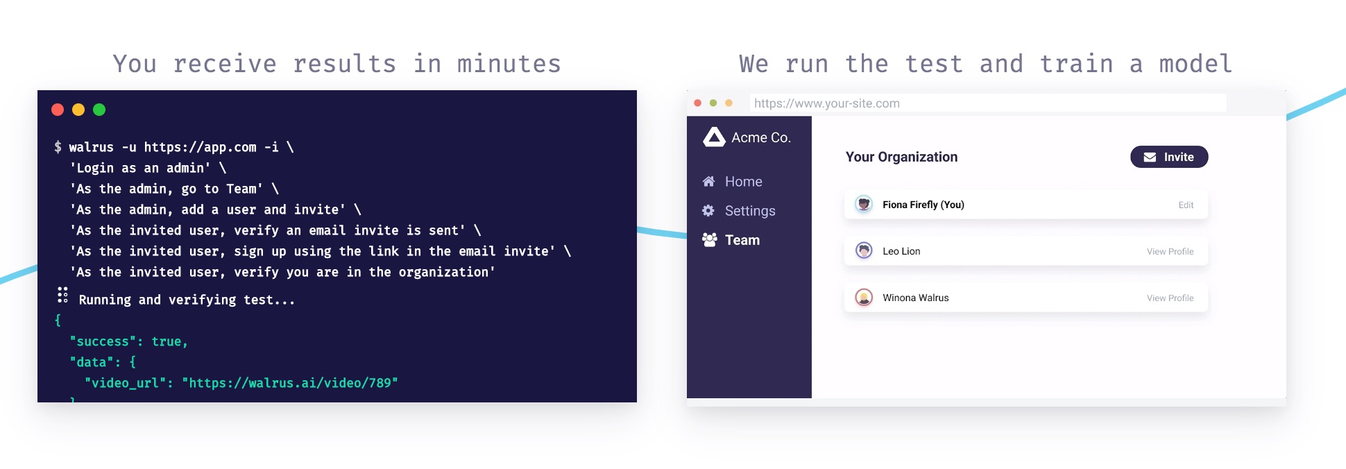 If you’re looking to save money and effort on testing your code, check out Walrus.ai. By providing full end-to-end testing via a single API call, it promises a more efficient and lightweight solution to in-house automated testing or manual QA. You just need to write and send your test via the walrus.ai CLI. Walrus.ai will then translate your instructions and build an automated test model, which returns results in a matter of minutes.