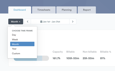 - In addition to “Month” and “Week”, Employee users can now select a “Day”, “Year” or “Custom” timeframe for viewing their capacity from their individual user page. Admins, Managers and Team Leads can apply the same to view the capacity of other users, in accordance with the access permissions of their role.
