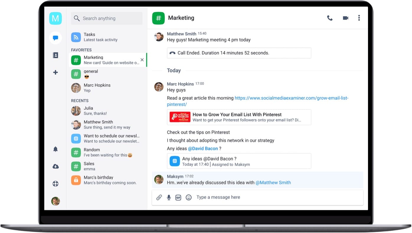 If you're looking for a Slack alternative that offers a lot for a modest price, check out Chanty. This team chat app is made with collaboration in mind and you can easily turn your messages into tasks and assign them to your team members. Other powerful features include voice messages, audio and video calls, screen sharing and native integrations with apps like Trello, Asana and Dropbox. Even in the free trial, Chanty packs a punch that will make you consider it as your new team chat app.