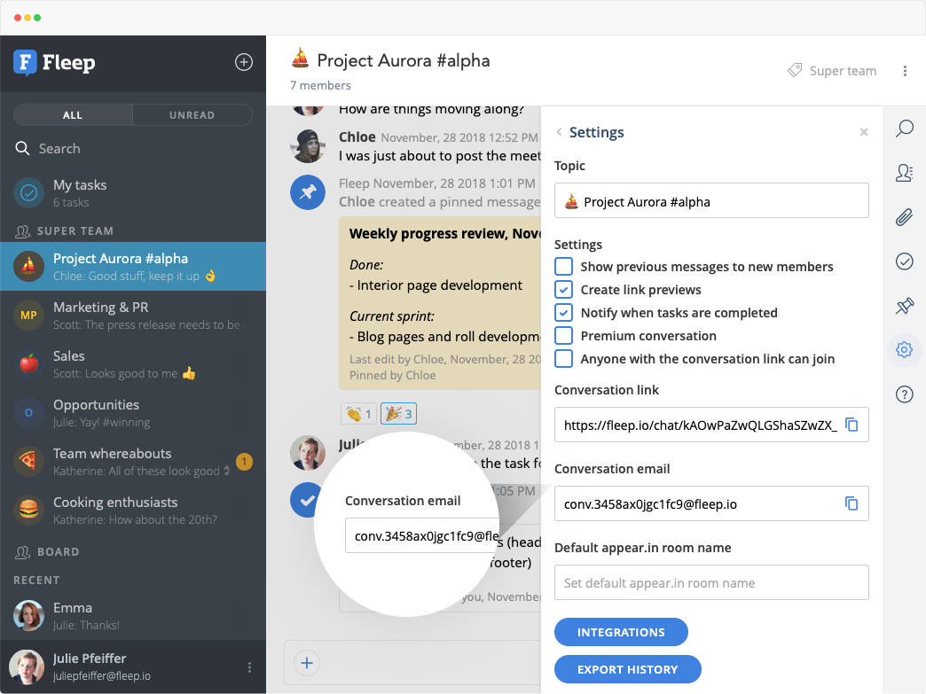 Offering a layout very similar to Slack, Fleep is also an ideal site for daily project and team communication. Each conversation has a pinboard, where you can highlight discussions, plans or decisions. Moving beyond discussion, you can set up tasks to organize and coordinate any new work. It’s accessible on mobile as well as web, and you can communicate with clients and consultants using Fleep outside your company without having to sign into a separate workspace.