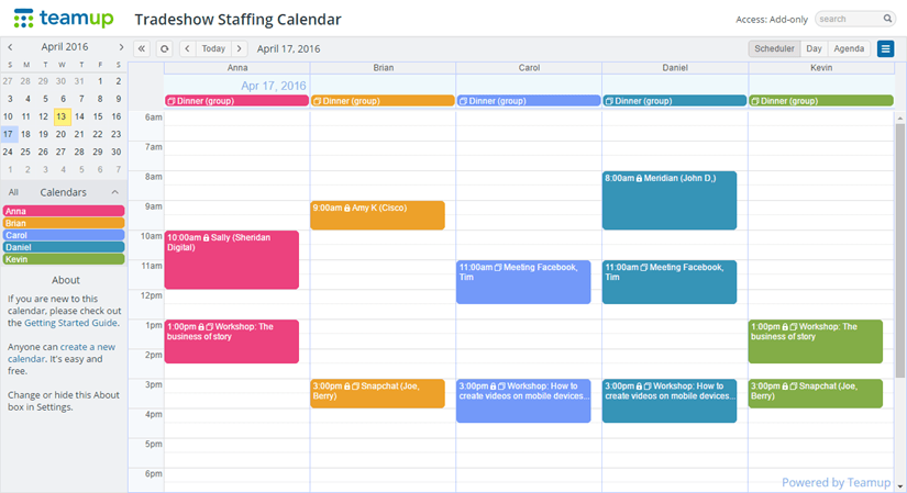 If there are only a few people in your team, you might want to use a simple shared calendar tool like Teamup to stay on top of everyone’s capacity. Teamup’s calendar view allows you to schedule team meetings and events, optimize your resources, cut down on any scheduling conflicts, and allocate work—all without losing sight of the big picture. Using sub-calendars, you can schedule work based on team members, locations, and events—and the color-coded calendars make it easy to stay on top of things at a glance.