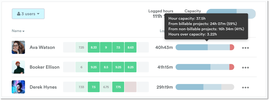 Timely’s visual reporting makes it super easy to spot employees who are struggling with an unmanageable workload, and the colour-coded capacity bar makes it easy to see how people are doing at a glance: dark blue for billable time; light blue for non-billable time; and red for overtime. Being able to quickly gauge team capacity allows you to help employees keep to their hours, balance multiple project plans, and ultimately, schedule resources in a more thoughtful manner.