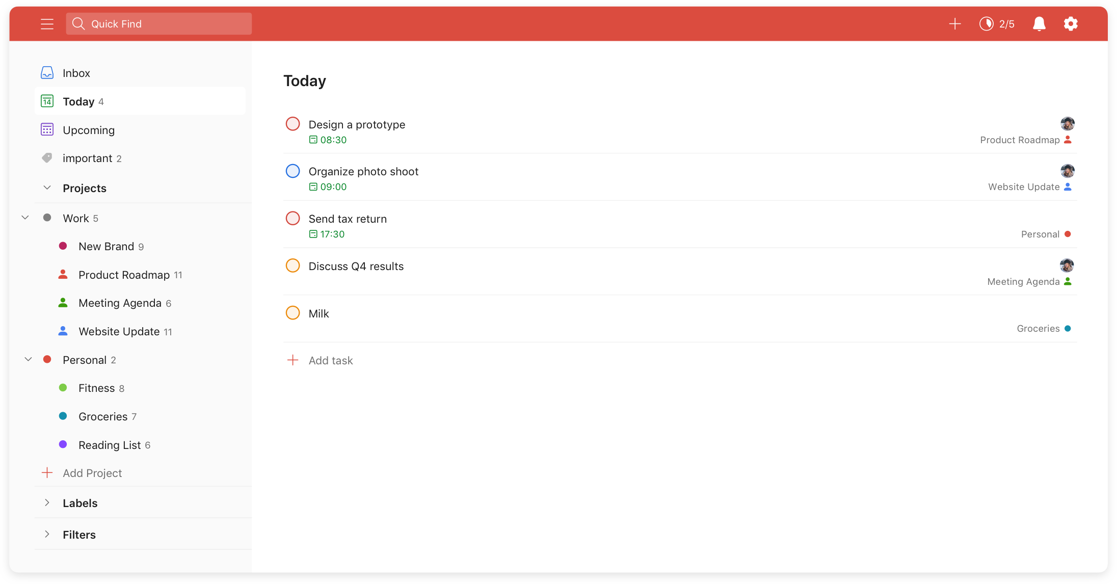 On a day-to-day basis, you can use the Today view to see all the tasks that are due across multiple projects, and from here you can make a realistic plan to get things done. Once you know what your priorities for the day are, you can mark them—which makes it easier for you to know what you need to focus on. It also helps you be realistic about what you can achieve.
