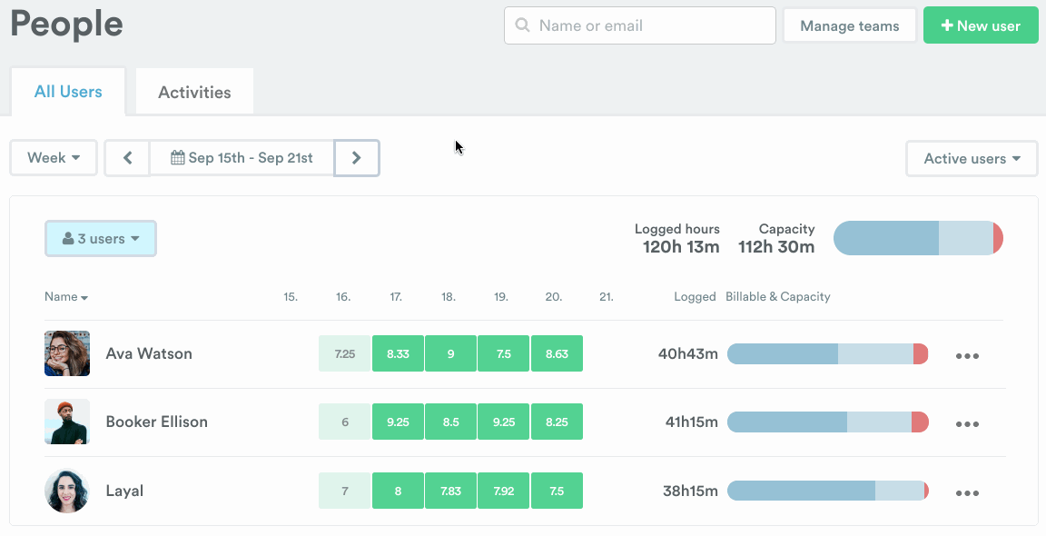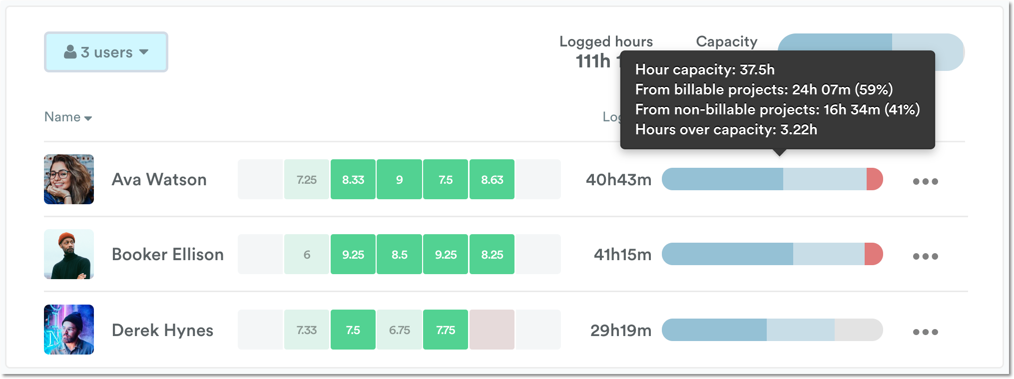 Managing team capacity sounds complex, but with the right tool it can be remarkably simple. Many team time management tools (as well as some project management software) offer this feature, albeit with slightly different UI. To give you an idea of how tracking team capacity works, here’s what it looks like inside automatic time tracking app Timely.