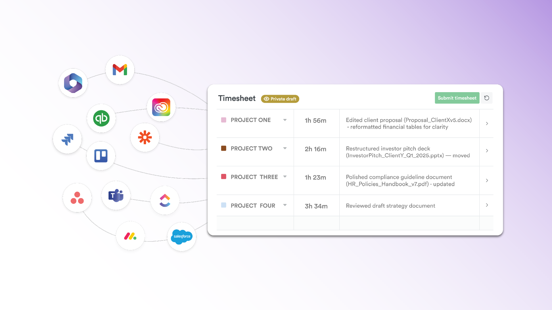 Every minute is automatically captured in the background so your team can keep focusing on the work that matters. Trusted by 5,000+ businesses worldwide, Timely proves that accurate time data doesn’t have to be hard work. Why risk your business on guesswork?