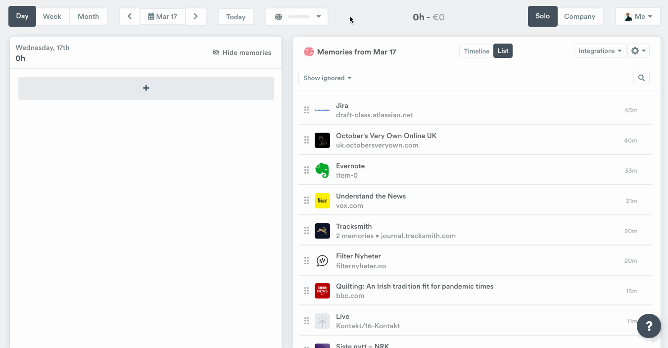 Timely looks at the time you actively spend on web and desktop apps (capturing page titles and timestamps only) and records all your daily activities to a private timeline that only you can access: