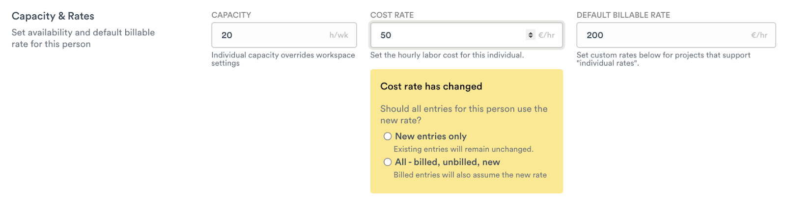 Provided you’re an admin, click "Edit user" for anyone on your workspace and you’ll find that you can now assign them an individual cost rate, in addition to a billable rate.