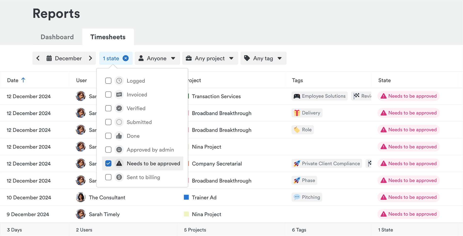 - Create Tags to get into further detail, such as a tag for vacation, sick leave or national holidays. Or perhaps in the office vs at home vs onsite. Be on top of your tool without micromanaging.