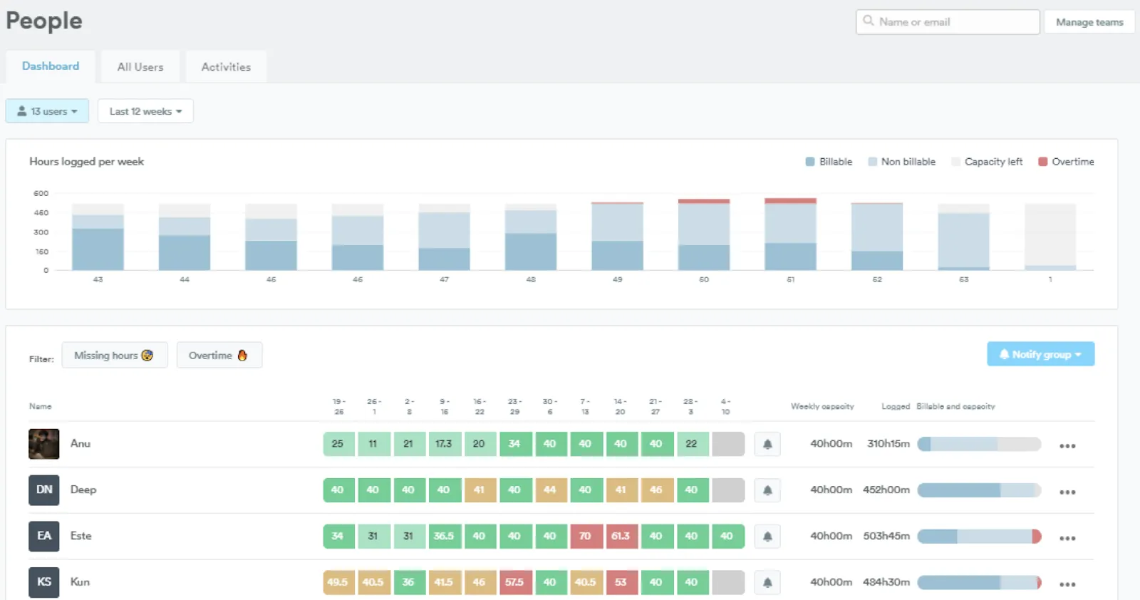 Managers and directors use Timely to understand team productivity and where time is being spent across the company. The People page is particularly useful for providing a high-level overview of employee hours – the visual color coding is great for grasping fluctuations in individual capacity.