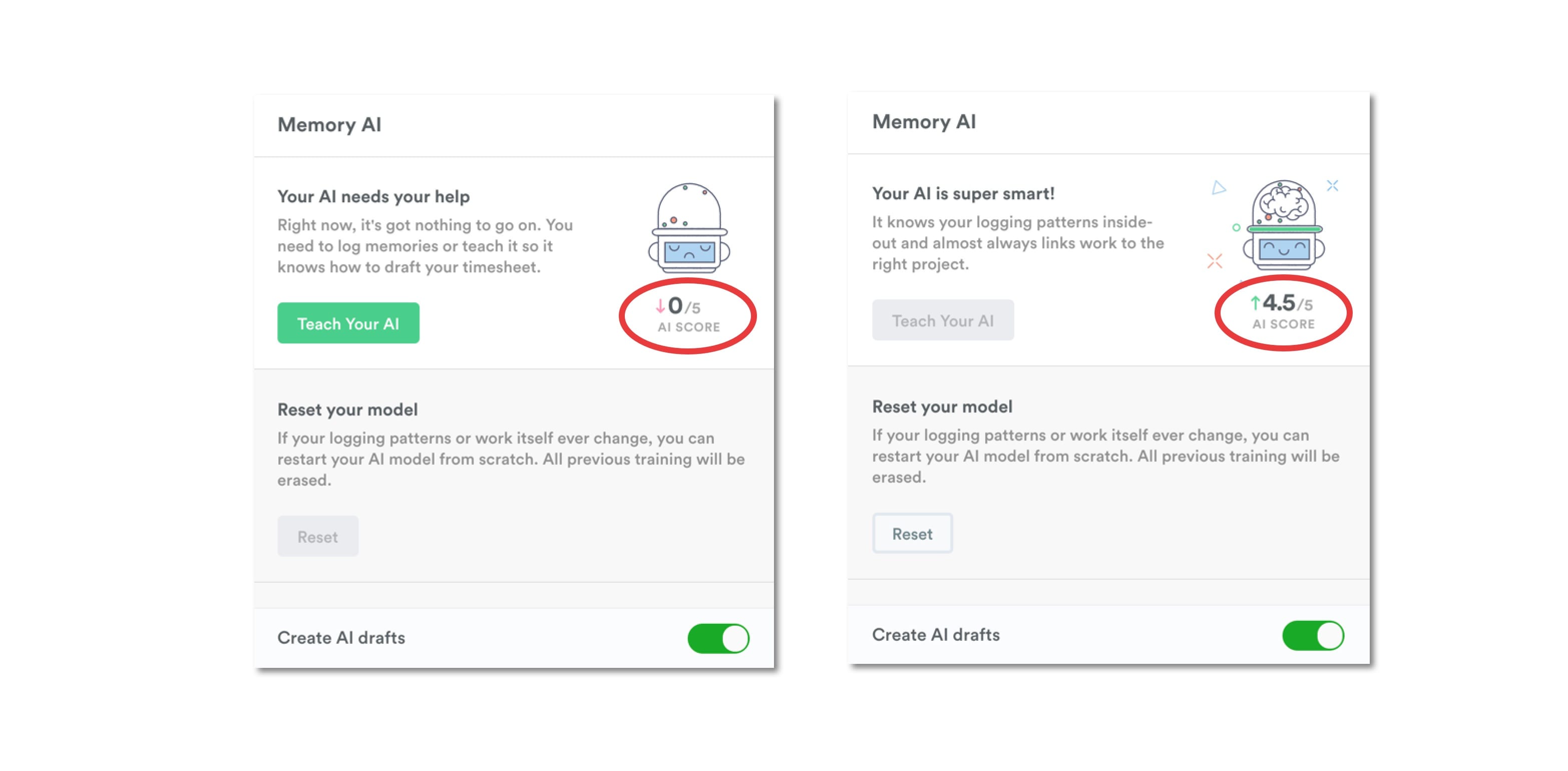 We’ve just released a slick “Teach your AI” experience that lets you dramatically increase the accuracy of your AI drafts. It proves that you don’t need to be a machine learning expert to train an AI model — you can now do it yourself directly in Timely! Providing you have AI drafts enabled, just hit the Memory brain icon in your top panel to get started.