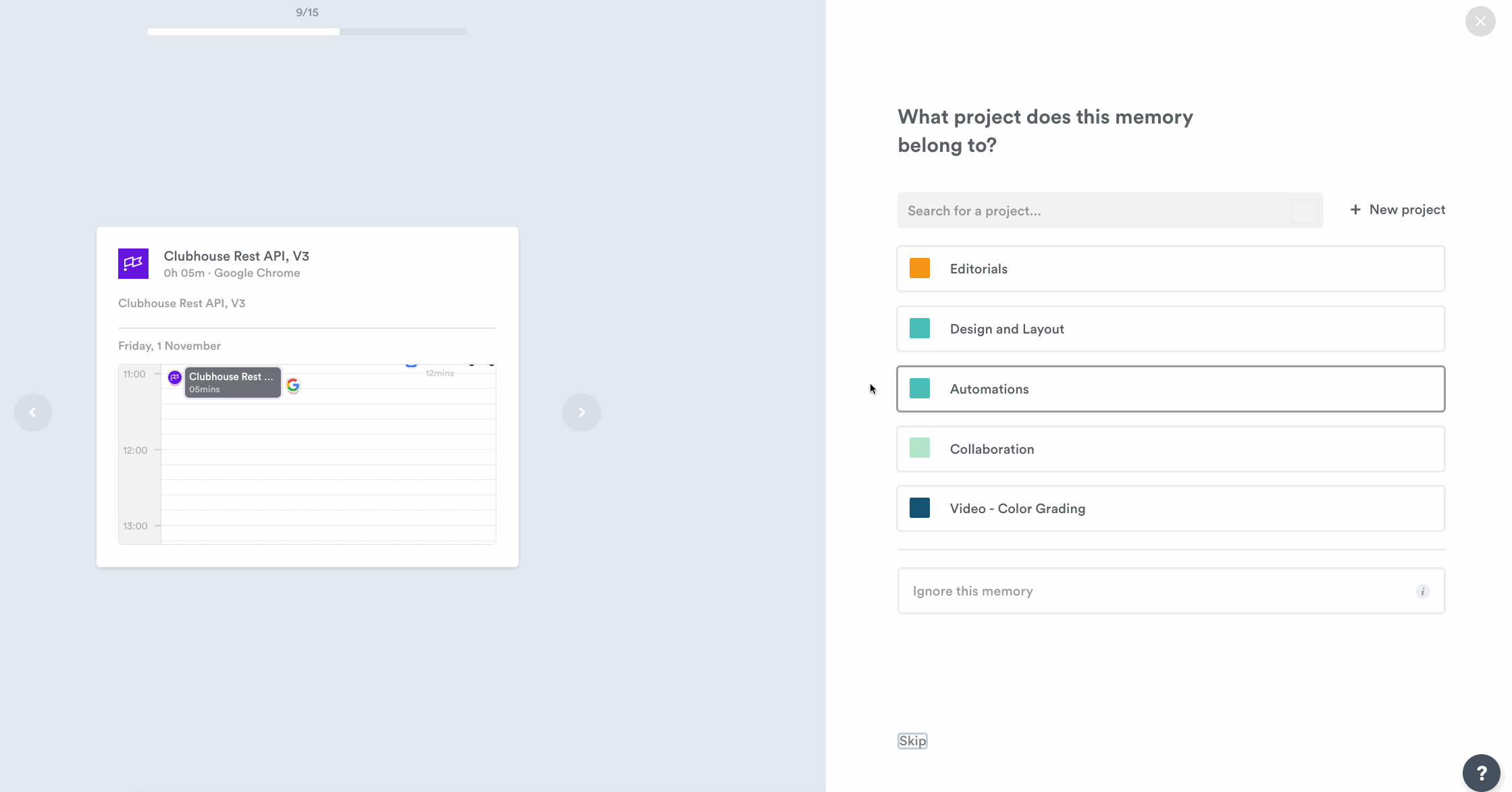 You can improve your AI’s score by hitting the green “Teach Your AI” button. This will start a short interactive training session, where you need to link a sample of memories to the right projects. This process helps train your AI to understand the nuances of your work, so it can make more accurate drafts. You also have the option to “Ignore” memories in this session, effectively telling your AI to exclude similar memories from future drafts.