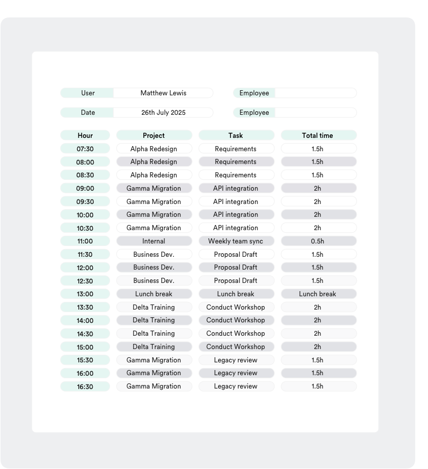 Traditional timesheets fail because they ask humans to remember.
