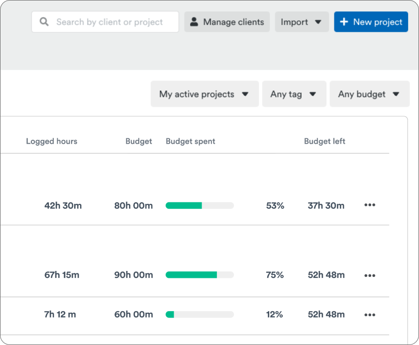 An all projects view for real-time tracking of key metrics like budget, hours, and progress, giving you a clear view of resources to make smarter decisions.