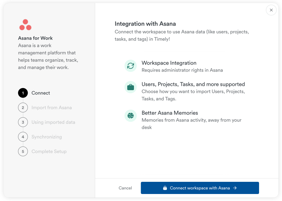 - Sync one or multiple Asana workspaces with one Timely workspace