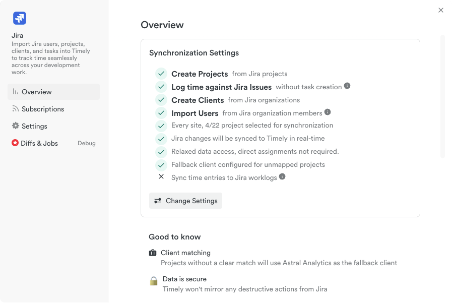 - Mapping: Jira Projects, Workspaces, and Tasks sync to Timely Projects, Clients, and Time Entries.