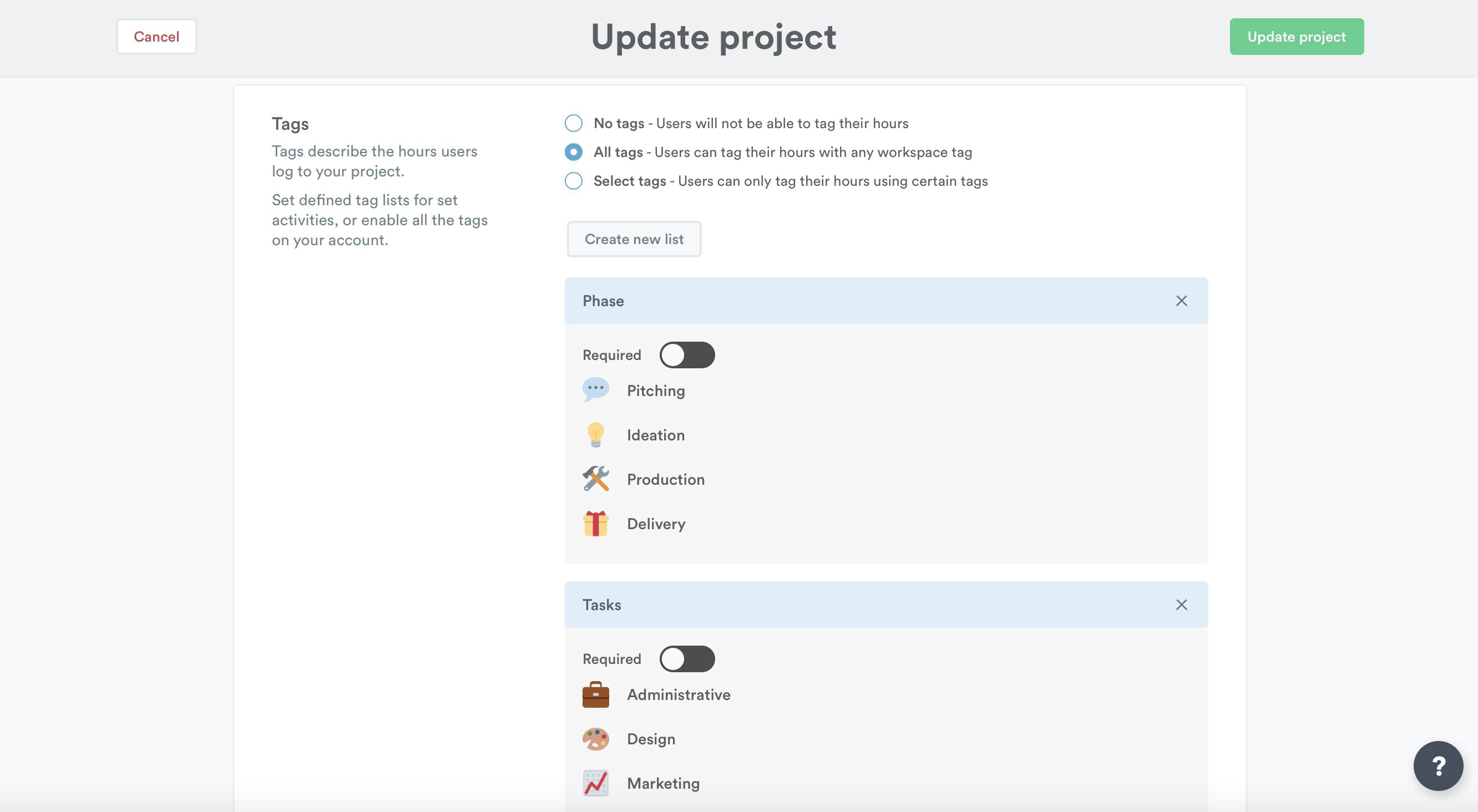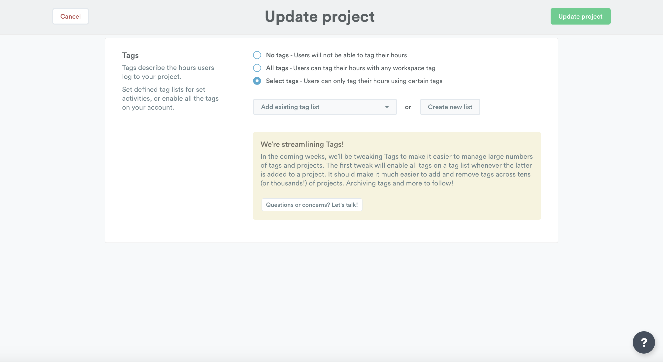 Upon selecting “All tags”, you still have the option to set required tags that employees must use when logging their hours. While developing this feature we added a neat little extra: whenever you add a new tag list to your global Tags settings page, it will automatically appear for projects where “All tags” is selected. Sub-tags from these lists — including those you add in future — will also appear automatically. More automation, less admin! 🦾