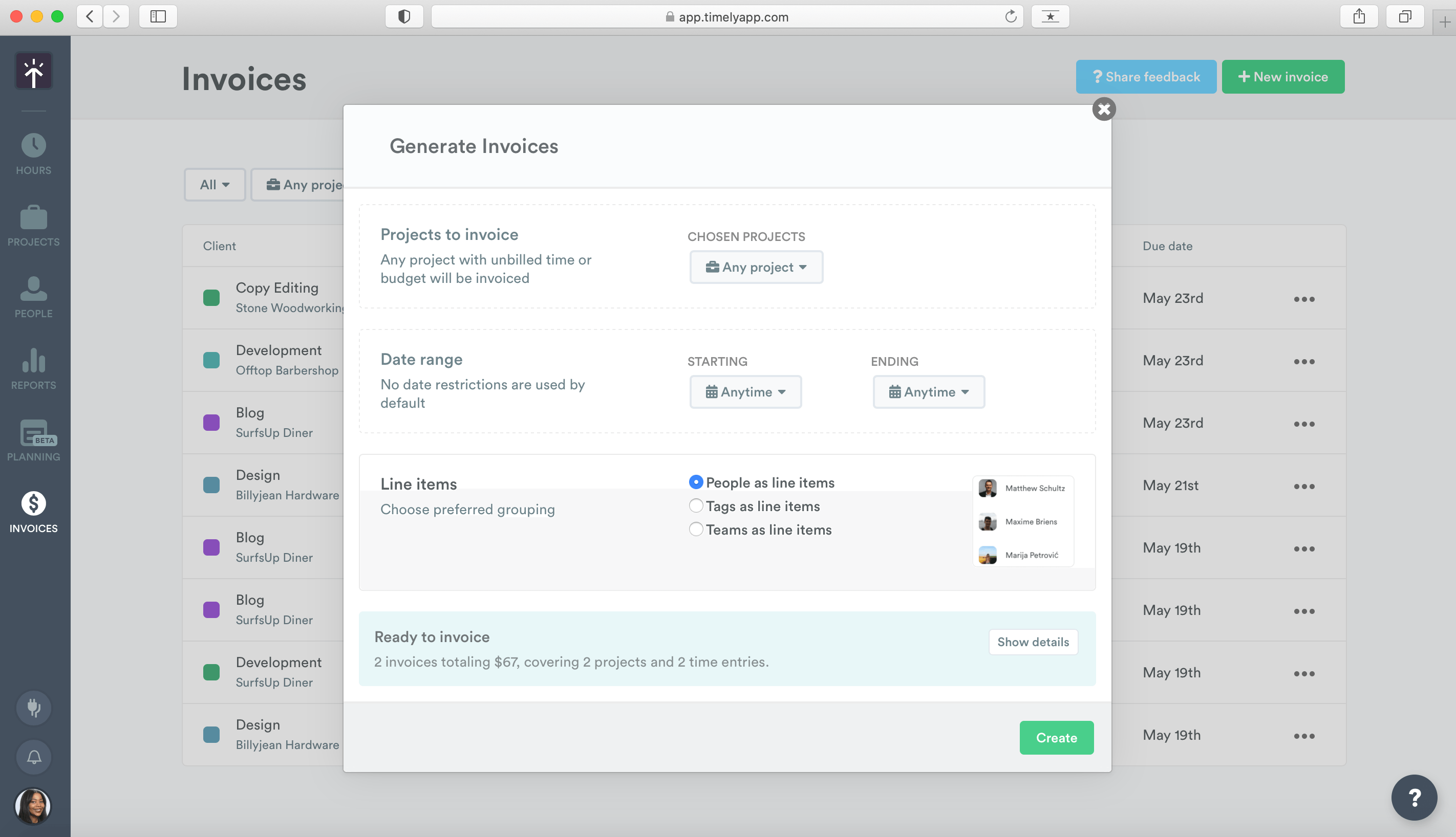 We want to give you as much flexibility around invoicing as possible, which is why you can choose to either invoice for all unbilled entries across your client base or all unbilled entries for a specific project. You can also choose the level of granularity you want to show in line items. If you prefer to invoice based on a project budget instead of unbilled entries, you can do that too!