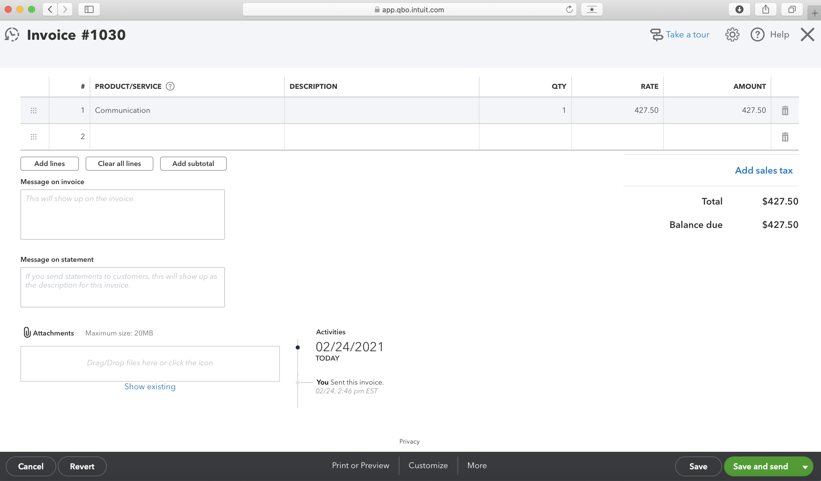 Once you’ve selected your invoicing preferences, click “Create”, review your draft invoice and hit “Send to QuickBooks”. From QuickBooks Online, you can then add custom details — like PO numbers, VAT and discounts — before sending your invoice on to your client.