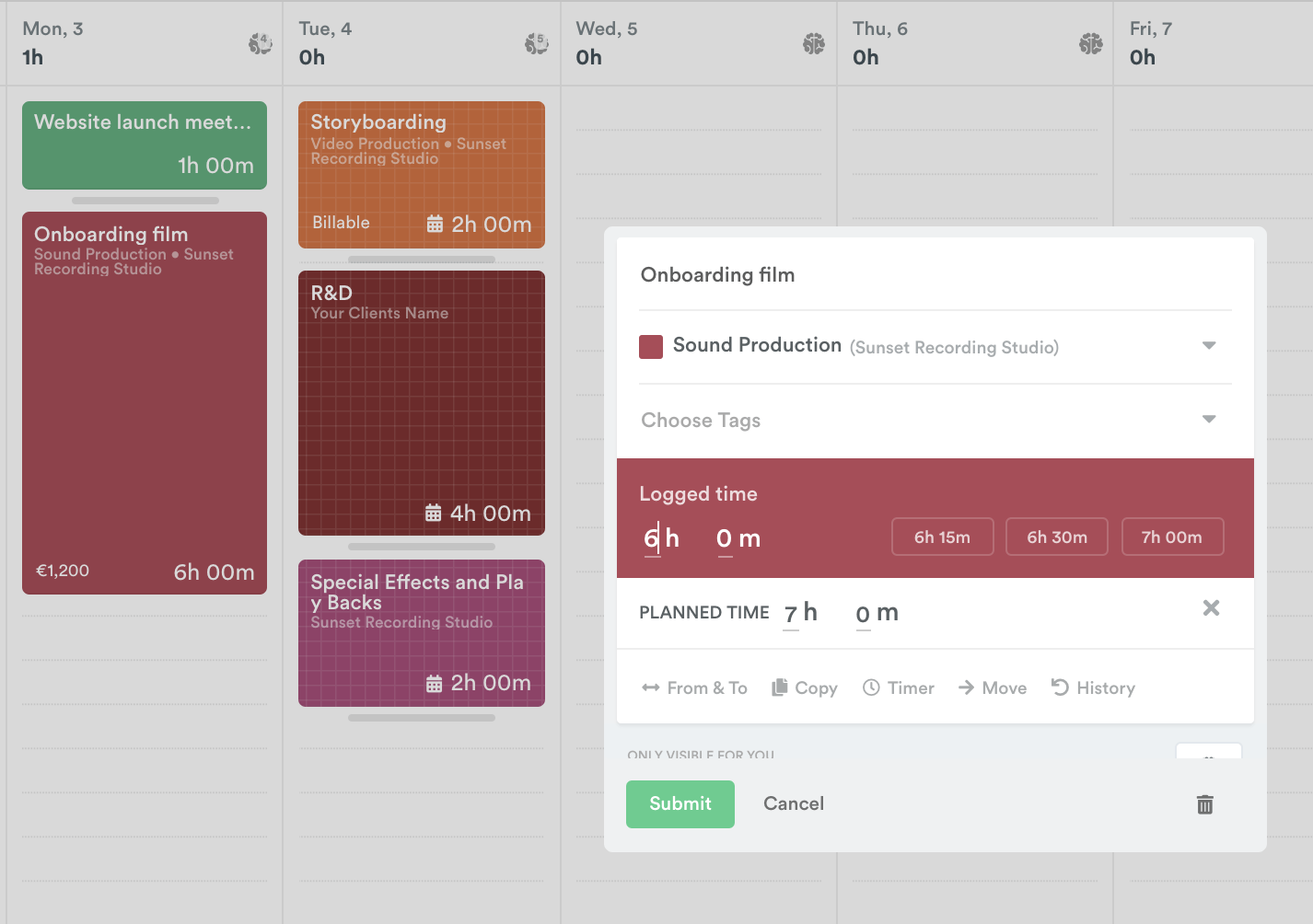 Once you’ve finished a piece of work, just update your planned entry to log time to it. This will change your entry to a solid colour, indicating it has been logged to your public timesheet.