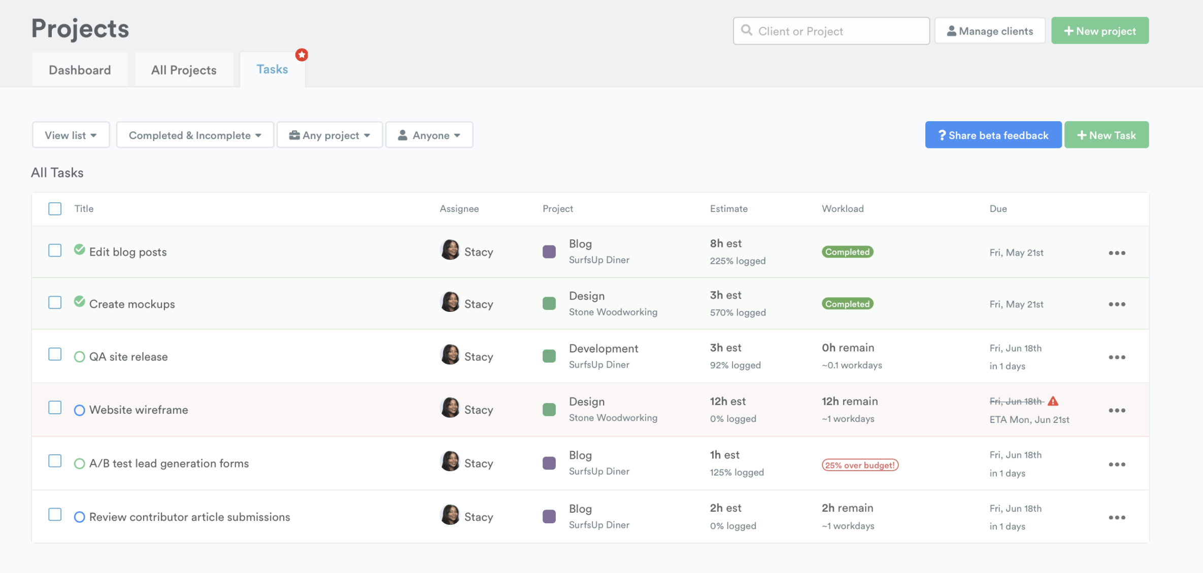 From the “Tasks” tab in your Projects and People pages, you can dive deeper into the detail—managing and reviewing all tasks for a specific project or person. Timely will also flag whether each task is progressing as planned or set to fall behind schedule.