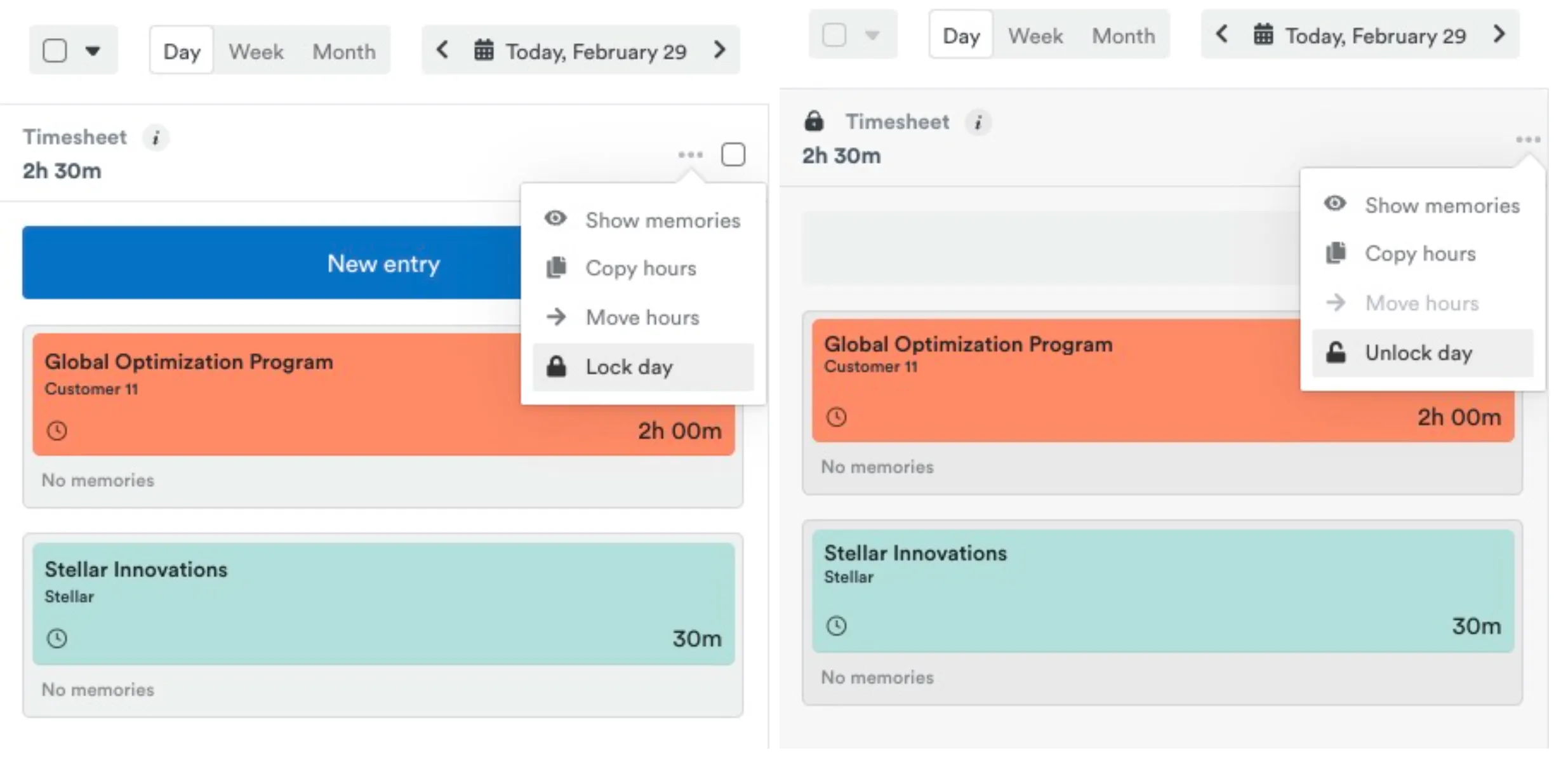 You can now “lock” entire days in your timeline, preventing accidental changes or edits - helping you keep your time records 100% accurate. Paired with Time entry states, managing timesheets becomes a breeze for admins and managers.