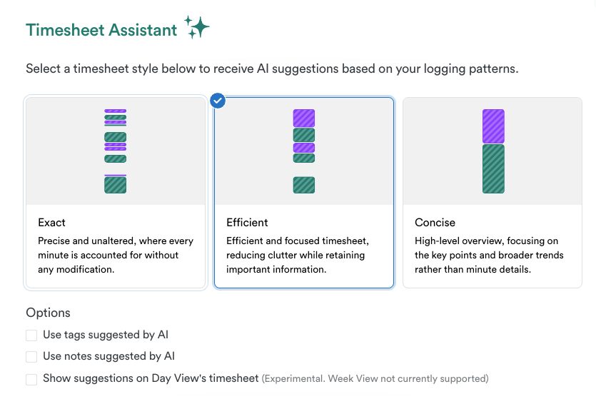To keep things simple, the assistant lets you pick from three timesheet styles—Exact, Efficient, and Concise—so you can decide how detailed or streamlined you want your logs. Your chosen style influences how entries are created, but you can always review the Assistant’s suggestions in the new Timesheet Assistant column before hitting that final save.