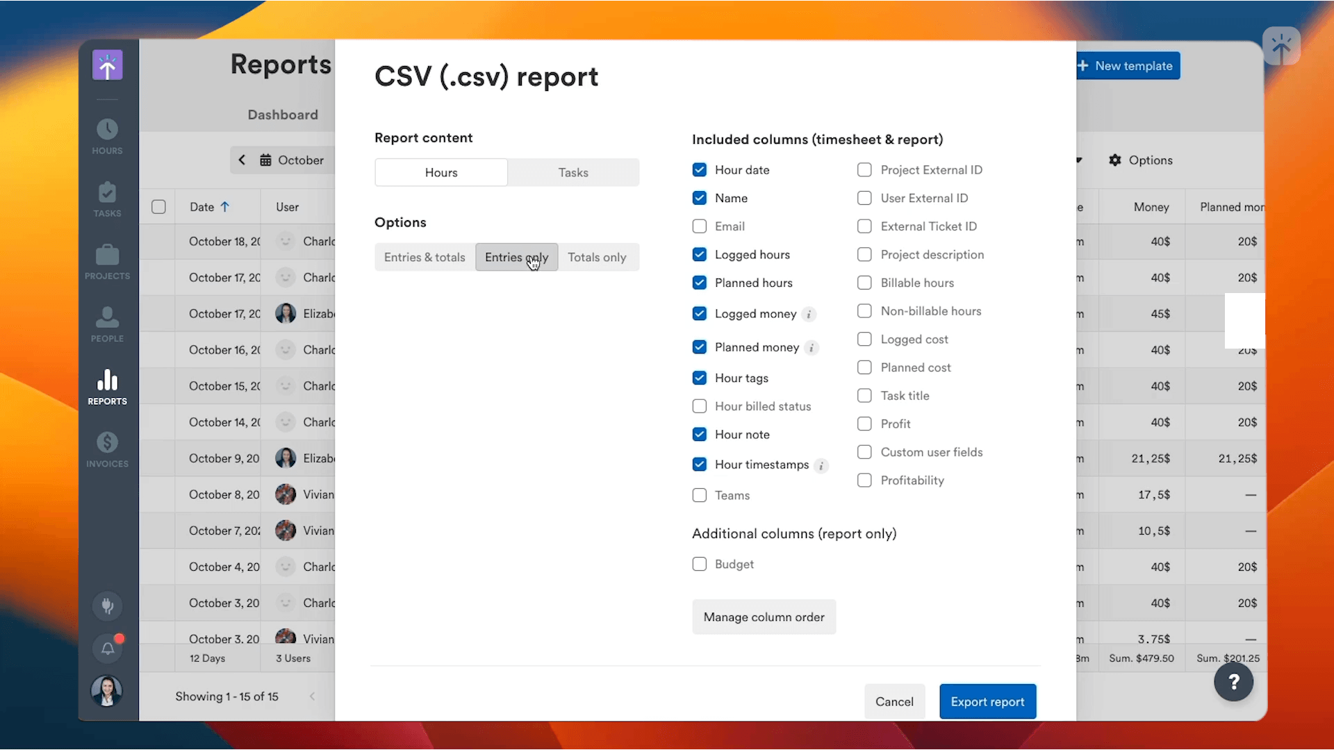 Simply head to the Reports section, pick your report, and when exporting to CSV, you’ll now see Project Descriptions as an option. Click export, and once the file downloads, you’ll find the descriptions in one of the columns. Easy peasy!